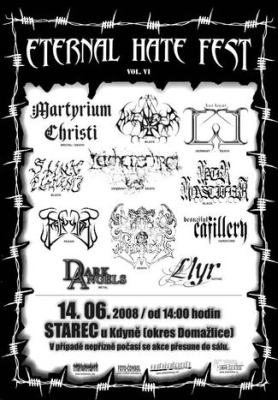 Malý jednodenní festival v lůně Šumavy, kde se každoročně v přátelské atmosféře schází celkem skromný počet lidí, kde ten zná toho a ve výsledku se tedy znají všichni dohromady a v neposlední řadě vrchol celoročního snažení pořádajících Martyrium Christi (jak sami říkají), to je Eternal Hate Festival. Celá akce se tradičně koná ve Starci u Kdyně, na malém plácku za místní hospodou na místě, které celou tu „rodinnou“ atmosféru výborně podporuje.