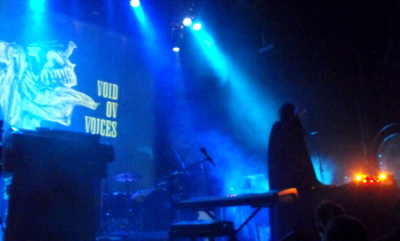 Palác Akropolis mi ako miesto určenia prišlo maximálne vhodné. Príjemná atmosféra, tak trochu útulné, ale hlavné je, že sál plus balkón s miestami na sedenie, poskytoval stále dostatok miesta pre relatívne vysoký počet zúčastnených. Prostredie teda bez debaty príhodnejšie, ako tá festivalová vrava v Jozefove. Začiatok akcie bol síce oficiálne posunutý na 19:30, ale inak to šlo ako švajčiarsky vlak podľa švajčiarskych hodiniek. Ani som teda nestihol preskúmať stánok s tričkami, vinylmi a inými suvenírmi a Attila Csihár, čoby one-man projekt VOID OF VOICES, už o pol mručal prvé slová do potemneného sálu, ožarovaného len sterilným modrým svetlom a pár sviečkami. Nie je to tak dávno, čo bol práve on ohlásený ako oficiálny „uvádzač“ ULVER. O tomto experimentálnom počine som mal doteraz len veľmi kusé informácie a preto som sa nechával prekvapiť, namiesto toho, aby som v predstihu pátral po dostupných nahrávkach na internete. Zahalený v čiernej róbe so špicatou kapucňou, pripomínal na pódiu niečo medzi SUNN O))) a nesvätým kazateľom. Ak som tomu správne pochopil, tak podstata približne polhodinu dlhého vystúpenia, spočívala v tom, že každý zvuk alebo slovo ktoré zo seba vydal, si následne cez pedál „nasľučkoval“ a naďalej sa tak pravidelne ozývalo z reproduktorov. S „podmazom“, ktorý si takto postupne vytvoril rôznymi variáciami šepotu, škrekotu, kazateľského hlasu alebo proste spevu à la Attila, následne pracoval digitálne a vytváral tak niečo na pomedzí noise-u a ambientu. Takže nedá sa povedať, že by celý projekt bol o tom, že si tam niekto celý čas len húka do mikrofónu. Zároveň určite nemusím podrobne opisovať, aká bizarná úchylnosť dokáže z niečoho takéhoto, pri Attilových hlasových dispozíciách a dostatočnej hlasitosti, vzniknúť. Ten časový priestor, ktorý bol pre VOID OF VOICES vyhradený sa javil ako absolútne postačujúci. Pretože napriek zaujímavosti, ktorou tento vskutku nevšedný akt disponoval, tá polhodinka bohato stačila, a po dvoch relatívne ucelených hlasovo-hlukových celkoch bolo hotovo. Každopádne, vytvoriť tak tuhú atmosféru len za pomoci hlasu a jednej neveľkej krabičky, si zasluhuje celkom obdiv. Pre niekoho možno klasicky nepochopiteľná nuda, kde sa nehrá ani na bubny, ale podľa môjho názoru ťažké zlo a hlavne skvelý úvod večera, s patričným puncom jedinečnosti!
