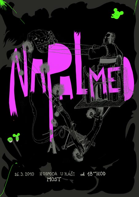 Minulý pátek jsem se vydal do sousedního města poslechnout severočeské hlukaře NAPALMED, kteří pro mě mají zvláštní postavení mezi ostatními umělci toho stylu. Celý výlet zkomplikovalo několik menších problémů. Ten první byla maličkost spočívající v tom, že město skoro neznám a nevěděl jsem, kde přesně se vytyčený lokál (U Káči) nachází, vyrazil jsem tedy s dostatečným předstihem a po kratší procházce do mne poloznámých končin jsem v šest hodin odpoledního času našel místo konání akce. Papír pověšený na dveřích zbořil mé iluze, neb hlásil, že akce byla přesunuta na záchytku (netušíc, že je to klub, jsem vyrazil na cestu zpět se smutkem v srdci). Hluk ale nakonec zvítězil, ohlédnul jsem se a zjistil, že mladý pár, který dorazil chvíli po mne si zprávu četl také, a muž ukazoval kamsi za mne. S nadějí, že by záchytka opravdu nemusela být místem, kde se NAPALMED léčí z bouřlivé oslavy pátku, jsem započal sledování (hned po tom, co mě předběhli).