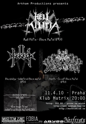 Dovolil bych si odhadnout, že pro každého fanouška francouzského black metalu, musela být zpráva o Pražské zastávce turné kapel Hell Militia, Blacklodge a Aosoth, velice příjemná, jelikož jsou tyto kapely složené z opravdových osobností francouzské black metalové scény. Avšak důvodem turné byla propagace nových, již vyšlých, či teprve chystaných desek všech zúčastněných.