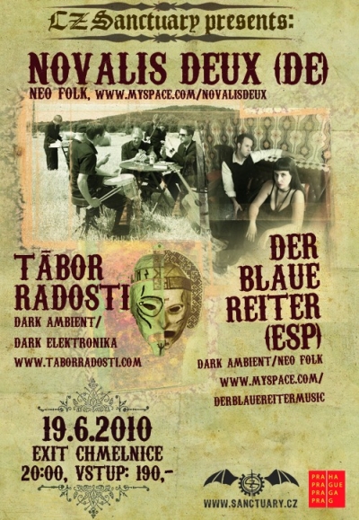 | První letošní neo-folkový večírek proběhne až těsně před letními prázdninami. Přinese celkem dvě nadějné akvizice vydavatelství Ars Musica Diffundere/Black Rain. První bude španělská dvojice Der Blaue Reiter, která ve své tvorbě zajímavým způsobem míchá dark ambient, ne nepodobný kapelám legendárního labelu Cold Meat Industry s melodickým neo-folkem. Druhá kapela, která se premiérově představí v Čechách, bude německá šestice Novalis Deux, která vydala zatím čtyři desky, z nichž ta poslední „Ghosts Over Europe“ zdařile pokračuje v odkazu, který před léty předali Death In June na legendárních deskách „But, What Ends When the Symbols Shatter?“ a „Rose Clouds Of Holocaust“. Důstojným domácím průvodcem bude tento večer jihlavská dvojice Tábor radosti. Novalis Deux (DE) Základními kameny kapely, která má své kořeny v německém Chemnitz, je dvojice kamarádů ze středoškolských dob, která začala spolupracovat v roce 1995. Stev Schumann a Marcel Hinkel nalezli společnou řeč velmi rychle a pojmenovali se Novalis podle německého básníka a prozaika, představitele raného romantismu domovského Saska konce 18. století. Po debutovém EP v roce 2000 začíná počet členů v kapele pomalu narůstat, až se dostane k současné šestičlenné sestavě s další hordou přátel, kteří pomáhají nárazově jak na koncertech, tak ve studiu. Zatím poslední deska „Ghosts Over Europe“ je jasným vrcholem snažení Novalis Deux a přinesla kapele velmi pozitivní ohlasy doslova z celého světa. Desítka kompozic je velmi silná po melodické stránce, a i když se nerozpakuje přiznat velký vliv Death In June, Current 93 nebo Spiritual Front, síle „hitového“ alba to pranic neubírá. Navíc je šestice stejně silná jak na studiových nahrávkách, tak naživo, kde vystupuje v plné, to znamená šestičlenné sestavě. www.novalix.cx STEV - Vocals, Guitar, Keyboards Marcel - Keyboards, Vocals Matthias – Drums Denise – Violine Sylvio - Guitar, Bass Jojo - Piano, Guitar Diskografie: First Cadence EP - Ars Musica Diffundere - 2001 Last Years Calling - Ars Musica Diffundere - 2002 Paradise...? - Ars Musica Diffundere - 2005 Ghosts Over Europe - Ars Musica Diffundere - 2008 Video ukázky: www.youtube.com/watch?v=KZranG8g9bw – Of the golden future time (r. 2007) Der Blaue Reiter (ESP) Dvojice Sathorys Elenorth & Lady Nott mate už názvem. Nejedná se o německý projekt navazující na expresionistické, téměř sto let staré hnutí, ale o dvojici ze Španělska, která v tomto projektu zkoumá nejhlubší zákoutí lidské existence. Zvuky z bojišť míchá s orchestrálními úryvky a velmi invenční hořkosladkou melodikou. Duo tak na třech deskách hněte svou hudbu ze zaprášených střípků evropských vzpomínek, které jsou (na rozdíl od sychravě mrazivé Skandinávie) částečně prosluněny hispánským sluncem. Tíživé vzpomínky na vlastní černé historické okamžiky přináší do muziky dvojice neoklasické rytmy a s nimi i obrazy plné zjitřených emocí smutku. Úkrokem směrem na Východ byla prozatím poslední deska „Nuclear Sun“, která přinesla hudební přemítání nad nukleární katastrofou výbuchu Černobylského jaderného reaktoru. Na živo kapela připomene v Čechách oblíbené Ordo Rosarius Equlibrio, kombinované s Triarii, kteří vynikli na posledním Prague Apocalyptic Evening. I Der Blaue Reiter mají naživo co nabídnout a rozhodně nejsou pouhým odleskem jejich vynikajících tří alb. www.myspace.com/derblauereitermusic SATHORYS ELENORTH: Vocals, Gitarre, Synths, Piano LADY NOTT: Vocals, Violine, Percussion Diskografie: Le Paradise Funèbre, L'Envers Du Tristesse - Caustic Records - 2006 Silencis - Caustic Records - 2008 Nuclear Sun - Chronicle Of A Nuclear Disaster - Ars Musica Diffundere - 2009 Video ukázky: www.youtube.com/watch?v=IZ1VjalPVbQ – Wave Gotik Treffen 2009 www.youtube.com/watch?v=JWArEbFms0o - Wave Gotik Treffen 2009 Tábor radosti Jihlavští Tábor radosti zazářili na domácí postindustriální scéně před pěti roky doslova jako meteorit. Po vydání alba „Hávamál“ a několika účastech na festivalech se jejich jméno etablovalo mezi nejfrekventovanější temně elektronická tělesa a tuto pozici stvrdili další výbornou deskou „Lamat“. Tajemná dvojice dál koncertuje doma i v zahraničí a pomalu připravuje k vydání materiál na další řadové album. Naživo působí dvojice jako tajemní kazatelé, kteří dokáží strhnout i přes minimum pohybu, zejména díky dotažené projekci a především hypnotické hudbě, spojující odkazy Scorn, Laibach nebo Lustmord ve velmi svébytný a originální tvar. www.taborradosti.com Diskografie: Tábor Radosti - Not On Label - 2001 Hávamál - Not On Label - 2003 Lamat - Epidemie Records - 2006 Video ukázky: www.youtube.com/watch?v=kqP-mFej8ZM – Kaz ve vzoru ![]() Zpět na novinky |